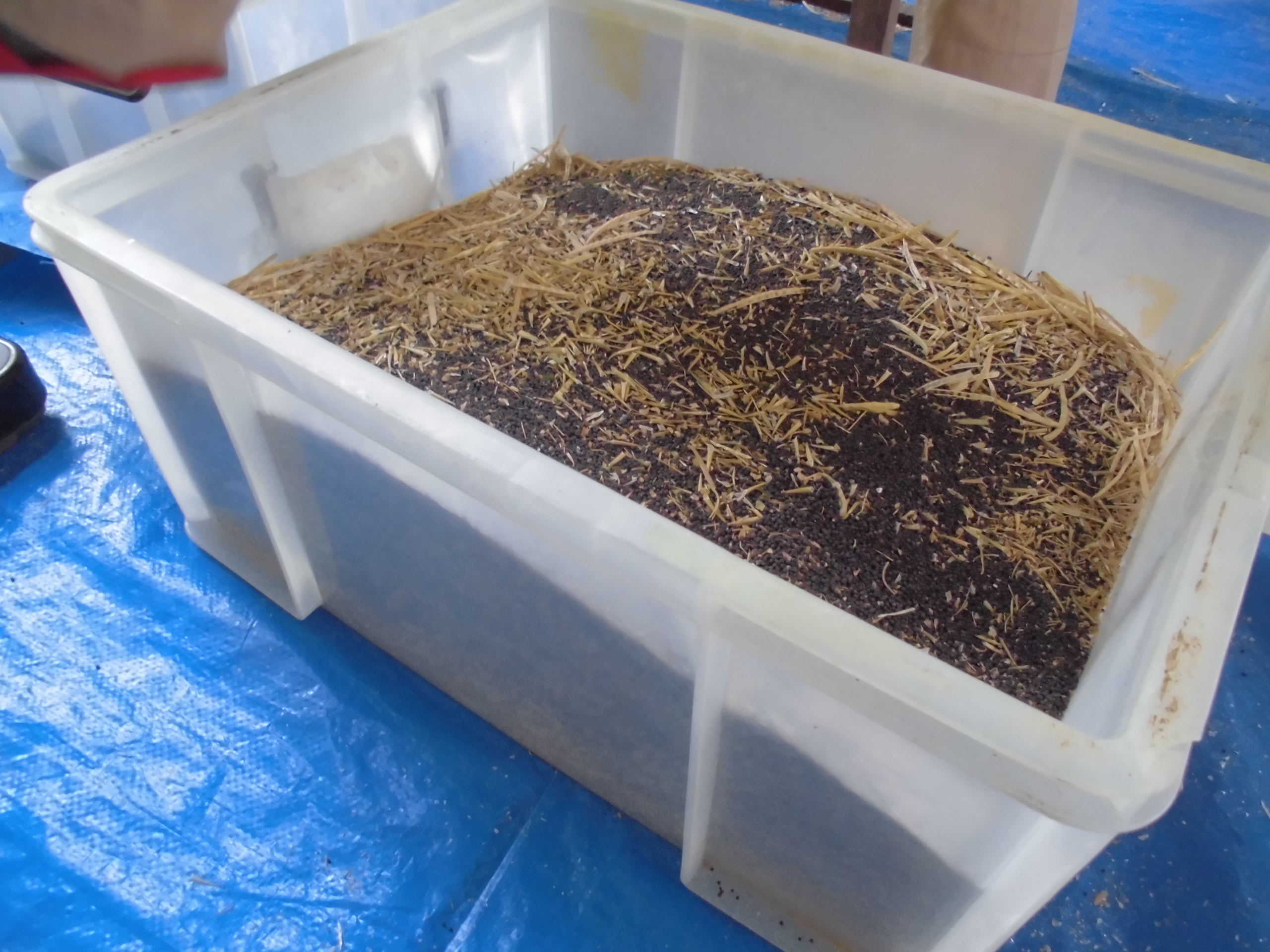 ふるいにかけて、さやとたねを分けます。
